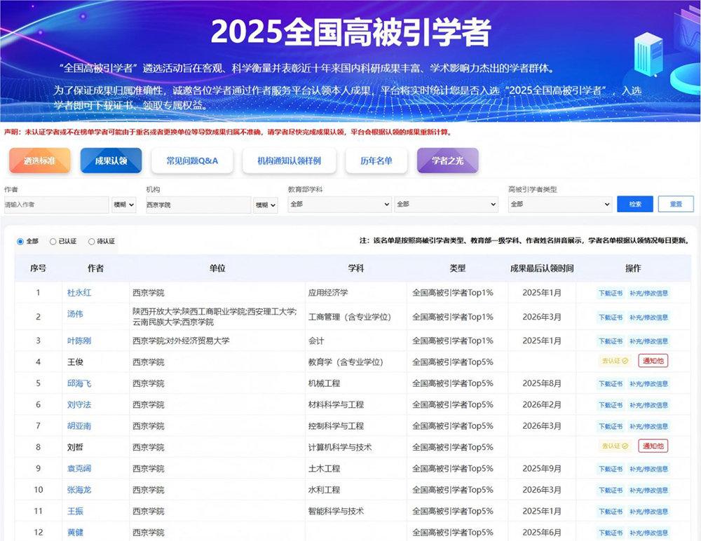 西京网讯:中国科学文献计量评价研究中心近日发布“2025全国高被引学者”榜单,我校12位学者入选。