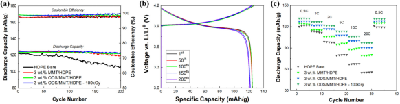 采用四种隔膜(纯HDPE、3wt.% MMT/HDPE、3wt.% ODS/MMT/HDPE及100kGy辐照处理的3wt.% ODS/MMT/HDPE)组装Li//LCO电池进行电化学性能测试。图9展示了循环稳定性和倍率性能的测试结果。