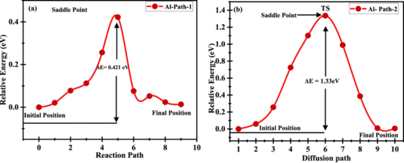 对于Mg离子的扩散研究(图11)显示:x轴向迁移势垒为0.55 eV,与MoS2(0.57 eV)相当;而垂直六元环方向的势垒升至0.95 eV,与B2C材料相近。Al离子的扩散表现出独特选择性(图12):x轴向势垒仅0.42 eV,但垂直方向势垒急剧增至1.33 eV。这些数据揭示: