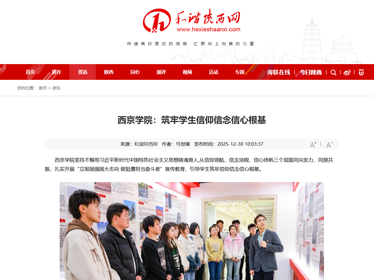——信仰领航:定向人生坐标,让理想信念扎根心间。加强学生理想信念教育,让信仰的光芒照亮学子心田。一是打造沉浸式思政课堂,让红色故事“活”起来。在讲深讲透讲活思政课的基础上,将课堂搬到革命纪念馆、红色教育基地、乡村振兴一线,组织学生赴延安革命圣地开展实践教学,厚植学生家国情怀;组织学生深入田间地头,见证脱贫攻坚丰硕成果;邀请大国工匠等劳动模范走进校园,他们用行动诠释最坚定的信仰,让学生在鲜活的故事中感悟信仰的力量。二是营造浸润式校园文化,让红色基因“传”下来。发挥校内中国共产党历史教育馆、史沫特莱展等“六馆一中心”育人功能,让红色文化春风化雨般浸润学生的日常生活。举办“烽火回声·青春誓言”抗战主题红歌合唱比赛,师生用嘹亮的歌声唱响爱党爱国主旋律,抒发对党和国家的无限忠诚与热爱。推出“红旗下的国际友人系列讲座”短视频,用学生喜欢的方式传播信仰的力量,让红色基因在潜移默化中浸润学生心灵。三是搭建多元化实践平台,让信仰力量“实”起来。持续开展学雷锋志愿服务系列活动等,引导西京学子参与敬老助残、环境保护、应急救援等志愿活动,他们在实践中经受了锻炼、增长了才干、坚定了信念,也深刻理解“为人民服务”的深刻内涵,将个人理想融入国家发展大局,让信仰从思想认同转化为行动自觉。