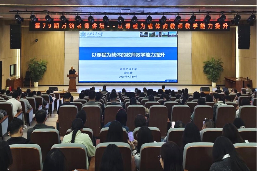 西京网讯:9月19日下午,第79期万钧名师讲坛举行。活动由教师发展中心主任谢明主持,国家级教学名师、西安交通大学徐忠锋教授担任主讲,内容为“以课程为载体的教师教学能力提升”。260余名教师参加。