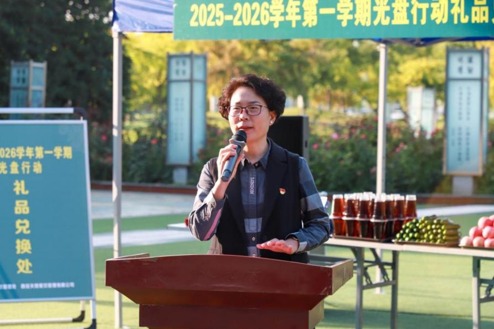 唐娣芬宣布“2025-2026学年第一学期光盘行动”正式启动。现场师生代表有序在“小餐盘,大美德——西京师生光盘在行动”桁架上签名,传递积极参与爱粮节俭的决心。