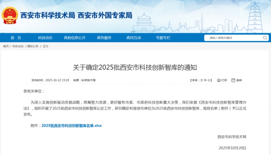 西安市科技创新智库由西安市科技局评选发布,是指具有丰富的科技创新决策咨询研究经验、拥有稳定且结构合理的人才队伍、在相关专业领域具有较强研究实力、能够高质量完成各类调研以及相关研究任务的科技创新决策咨询研究平台,主要围绕西安科技创新发展全局性、战略性、前瞻性问题开展深入研究,服务市委、市政府科技创新重大决策。