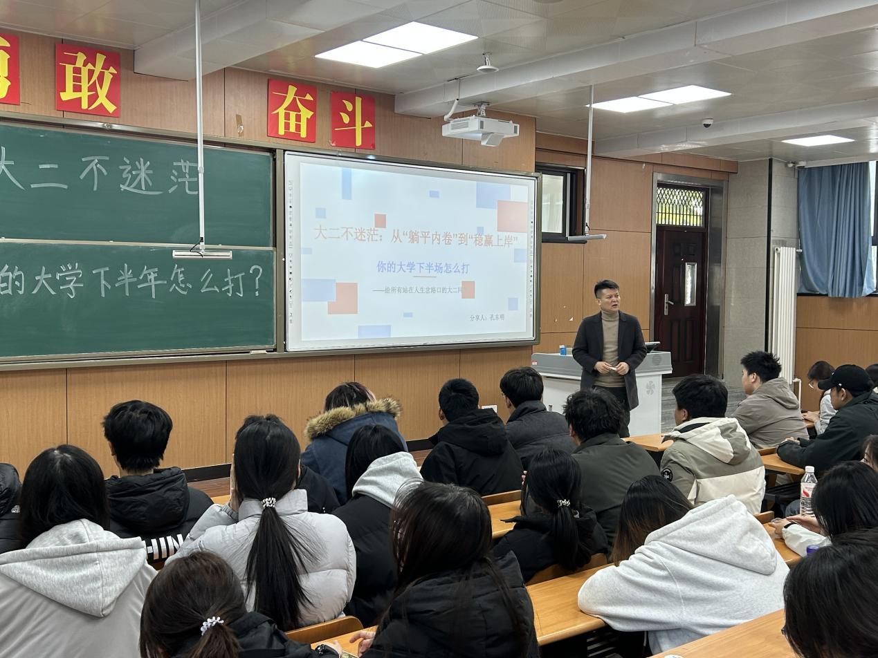 3月19日,校外辅导员孔东明以“大二不迷茫:从‘躺平内卷’到‘稳赢上岸’”为主题开讲,精准剖析大二学生的学业焦虑、职业迷茫等问题,从专业学习、实践锻炼等方面给出六项可操作行动建议,还针对简历优化、跨专业深造等问题逐一答疑,有效缓解了学生的成长困惑,帮助其明晰大学后半程发展思路。