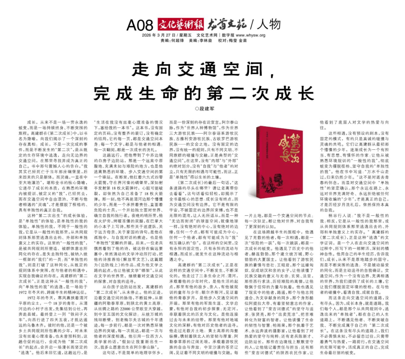 3月28日,著名作家、“文学陕军”代表人物高建群散文新作《第二次成长》首发式在西安曲江书城举行。西京学院外国语学院教授、学科带头人段建军受邀出席活动,在核心对谈环节从哲学维度深度解读作品内核,其同名主题理论文章刊发《文化艺术报》。