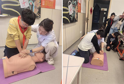 在互动实践环节,同学们踊跃参与、亲手操作,在老师指导下认真掌握按压深度、频率与手法要领,在亲身体验中学会实用急救技能,深刻感受科学知识守护生命的重要意义。