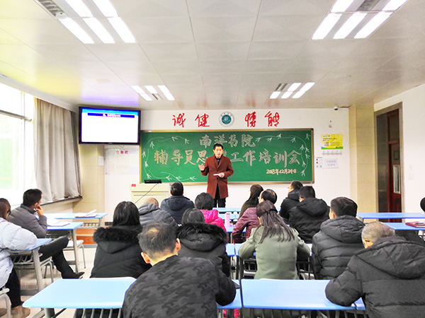 12月24日下午,南洋书院组织开了辅导员思政工作专题培训会,校思政部副教授王俊受邀为与会人员作题为“新时代高校思想政治工作的新要求”主题报告。书院院长庞舒月、发展科科长范光、事务科科长丁照勇、科室学工干部及全体辅导员老师参加了会议。
