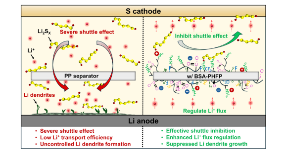 在这项研究中,成功制备了一种用BSA-PHFP改性的功能分隔器,以应对锂硫电池中多硫化物的穿梭效应和不规则锂沉积。变性BSA与PHFP的结合形成了一种稳定且灵活的基质,提供了丰富的极性功能基团,增强了分隔器的机械强度和电解质润湿性。结果是,装配了BSA-PHFP改性分隔器的锂硫电池展现出改善的电化学性能,包括782.1 mAh g⁻¹的初始放电容量和500个循环后的414 mAh g⁻¹。该研究提供了一种绿色、可扩展且高效的策略,用于构建高性能锂硫电池中的先进分隔器。