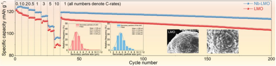图1.铌(Nb)掺入尖晶石结构的LiMn2O4体系,可同时提升离子扩散动力学与颗粒尺寸。铌掺杂后整体表面能降低,促进了颗粒生长。尽管颗粒尺寸增大,铌元素的引入显著提升了倍率性能,并在循环过程中有效抑制了极化现象。晶格参数的扩展与阳离子序列的优化,既促进了锂离子传输,又抑制了锰元素溶出,从而在45°C高温条件下仍能保持卓越的循环稳定性与高倍率性能。