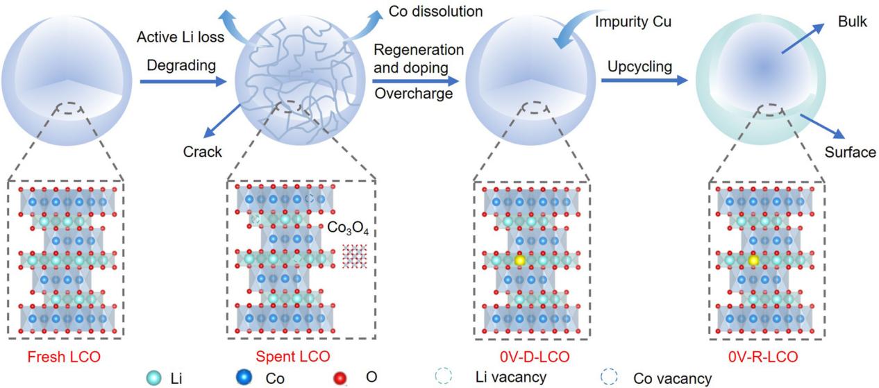 本研究提出了一种利用废旧锂离子电池过放电,将阳极上的铜沉积到LiCoO2上的策略,从而促进后续的升级再利用。该方法消除了升级再利用过程中对额外材料输入的需求,在减少资源消耗的同时,还能制备出高性能材料。鉴于电池中大多数元素的适度掺杂通常对正极有益,未来研究可致力于开发可控方法,以在电池运行期间或整个回收过程中调节这些元素的含量。这将进一步降低锂离子电池回收的总体经济成本、材料消耗及环境影响。