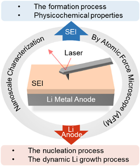 锂(Li)金属复杂的生长行为给理解锂电池的工作机理带来了重大挑战。固态电解质界面层(SEI)复杂的组成和结构,使得表征锂金属负极中动态且复杂的电化学过程变得更加困难。其中,对锂金属生长的实时观测尤为困难。幸运的是,原子力显微镜(AFM)已成为一种强大的工具,为界面研究提供了宝贵的原位和纳米尺度见解。其独特的接触检测方法、极高的Z轴灵敏度、多样化的工作模式以及在电池运行过程中进行实时检测的能力,使AFM成为一项关键的分析手段。本文旨在全面探讨AFM在锂电池负极研究中的最新进展。特别关注锂电池中固态电解质界面(SEI)的形成过程及其各种性质。此外,本文还汇总并评估了现有关于基于AFM的锂金属成核、沉积和剥离过程的研究文献。其目的是阐明锂金属的生长机制,并阐明影响其生长的因素。