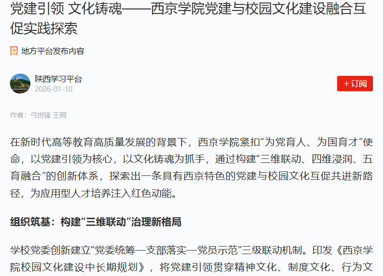 学校立足创办“有远见、有使命、有智慧”的高水平大学初心使命,突出“匠心精神+艺术素养”人才培养特色,通过持续探索实践,西京学院党建引领文化建设成效显著:学校获批陕西省“文明校园”“平安校园”,2个党支部入选全国党建工作样板支部,学生在“互联网+”大赛等国家级赛事中获奖数量年均增长18%。这种“党建红”与“文化润”的深度融合模式,不仅强化了师生的政治认同,更培育出“无私奉献、报国为民、挑战极限、追求卓越”的精神,为培养担当民族复兴大任的时代新人提供了鲜活样本,相关经验被“学习强国”学习平台、中国教育报、陕西日报等媒体专题报道,成为新时代高校党建创新的生动实践。(弓世锋 王侗)