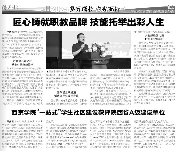 阳光讯(记者 刘杰 通讯员 刘玉洁 李浩伟)近日,陕西省教育厅公示高校“一站式”学生社区综合管理模式建设质量评级调整名单。西京学院凭借突出成效和创新实践,获评A级建设单位。这标志着该校在落实立德树人根本任务,深化“三全育人”改革,将学生社区打造为融思想教育、师生交流、文化活动、生活服务于一体的育人新生态方面,取得了重要成果。