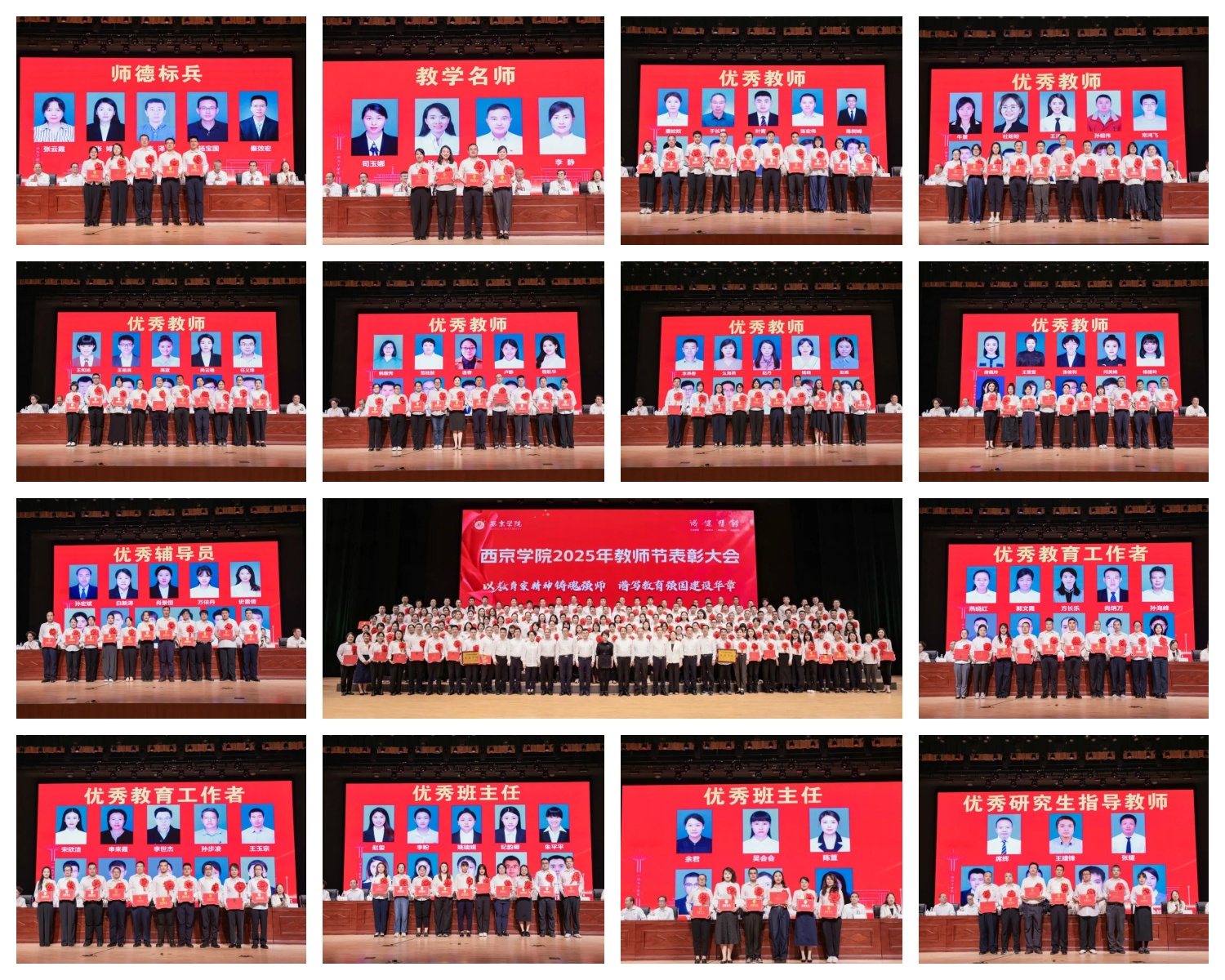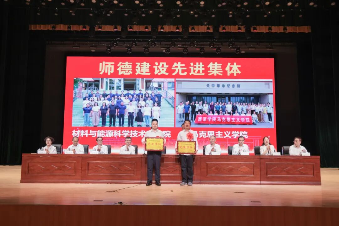 在第41个教师节到来之际,为大力弘扬教育家精神,进一步激发全校教职工的积极性和创造性,鼓励大家爱岗敬业、勇于探索、无私奉献,西京学院对先进集体及个人予以表彰。马克思主义学院、材料与能源科学技术研究院获评“师德建设先进集体”;杨宝国等5人获评“师德标兵”;张胜等4人获评“教学名师”;张宏伟等73人获评“优秀教师”;蔡云超等11人获评“优秀辅导员”;杨金花等47人获评“优秀教育工作者”;文立磊等19人获评“优秀班主任”;袁宝玺等8人获评“优秀研究生指导教师”。校领导为获奖集体及个人颁奖,现场掌声阵阵,气氛热烈。