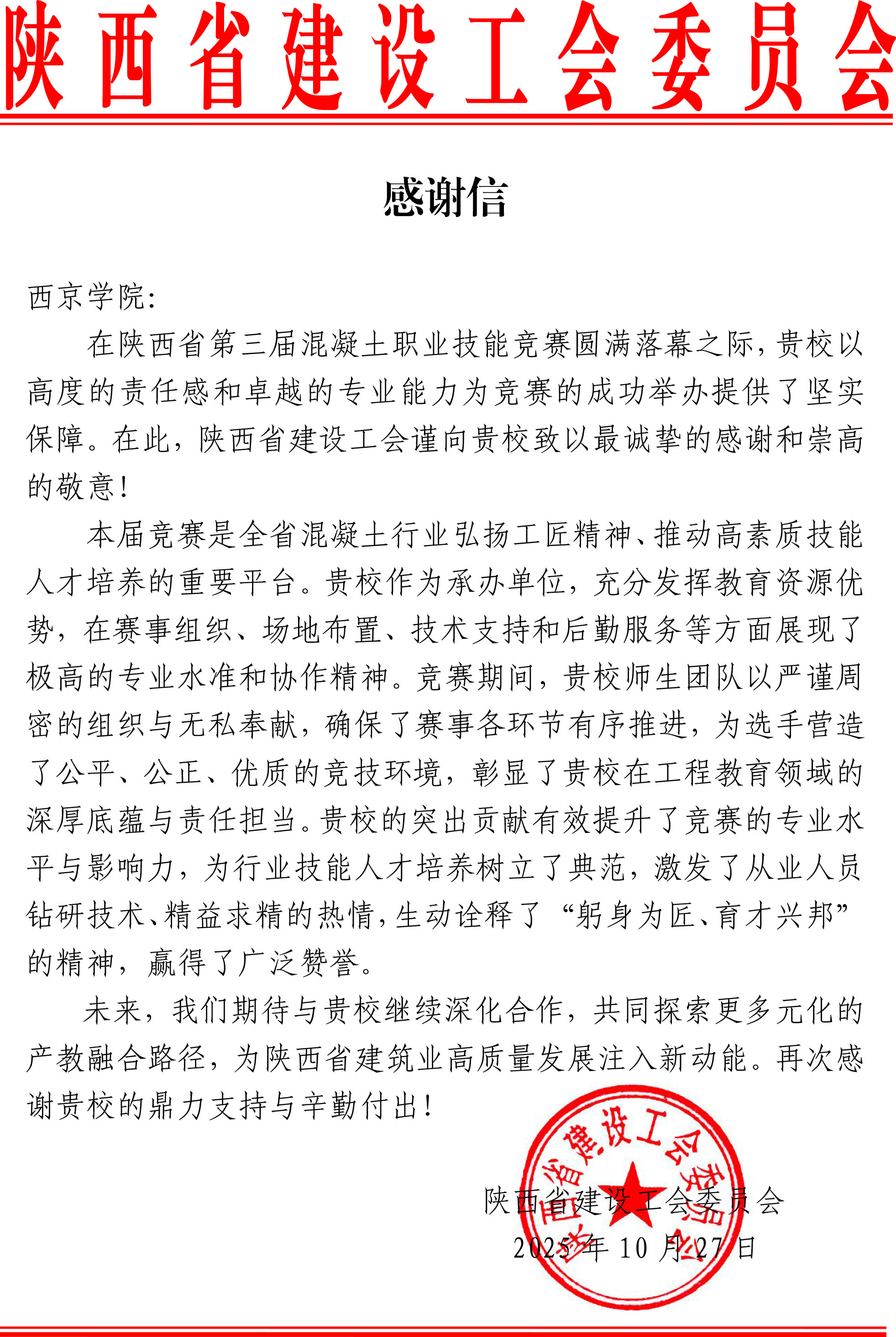 陕西省建设工程委员会在赛后专门向西京学院致感谢信,对学校在赛事组织、场地布置、技术支持和后勤服务等方面展现出的极高专业水准和协作精神表示诚挚感谢。信中指出,西京学院师生团队以严谨周密的组织与无私奉献,确保了赛事各环节有序推进,为选手营造了公平、公正、优质的竞技环境,有效提升了竞赛的专业水平与影响力,为行业技能人才培养树立了典范。