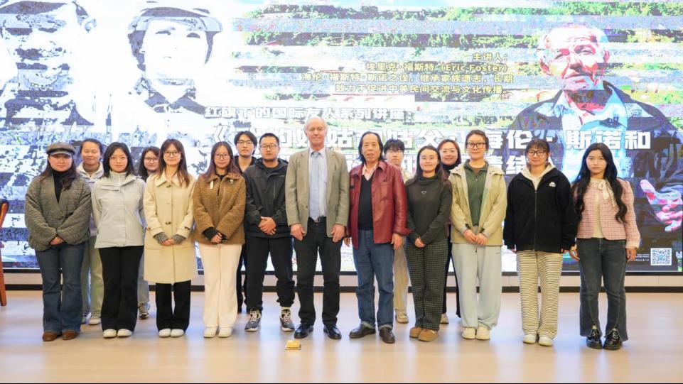 西京网讯:11月13日下午,“红旗下的国际友人系列讲座”首场活动举行。活动主题为《我的姑姑和姑父:海伦・斯诺和埃德加・斯诺的中国情结》,由陕西省斯诺研究中心与西京学院外国语学院党委联合主办。海伦・斯诺侄子埃里克・福斯特担任主讲,西京学院外国语学院院长胡宗锋教授主持。约300名师生参加。