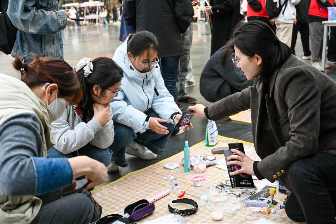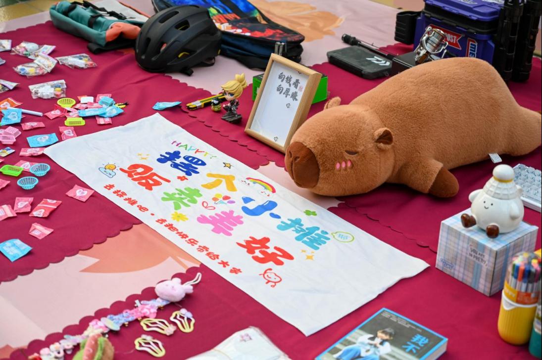 在闲置物品区,二手书籍、文具、玩偶及原创手作琳琅满目。旧书籍在摊位间形成“知识漂流”,有同学淘得绝版画册,也有同学将闲置小说交换给新读者;闲置玩偶、文具被摊主精心布置,带着故事的小物件在市集里找到新归宿,让“断舍离”有了温暖的注解。同时,特色文创区摊位备受关注,同学们的插画、手工艺品创意十足。