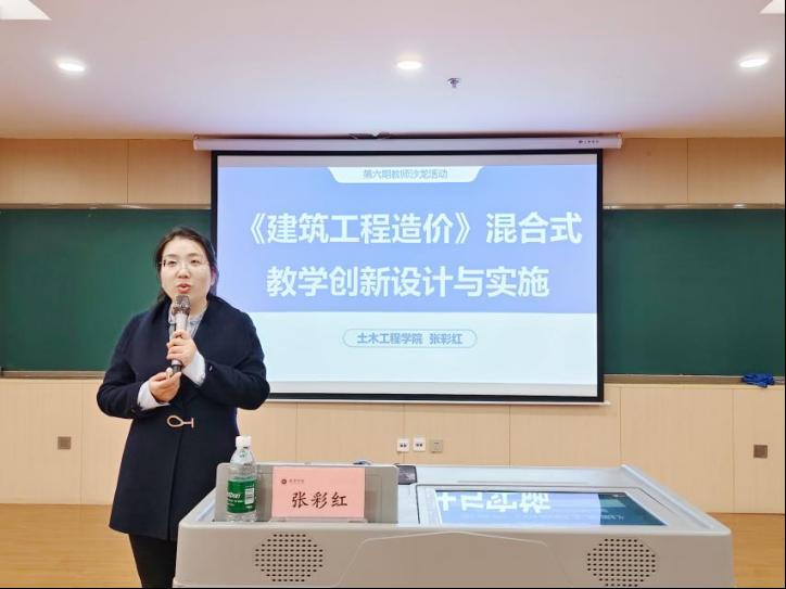 12月10日的第六期沙龙,土木工程学院张彩红副教授以“《建筑工程造价》混合式教学创新设计与实施”为主题展开讲述。她结合参赛经历,介绍了课程混合式教学的设计创新、具体做法与效果,并分享了参赛注意事项及心态调整策略。