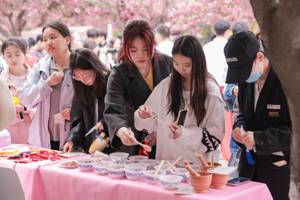 樱花林内,至诚书院与创业书院联合打造的“关中民俗文化街区”人头攒动。秦腔脸谱绘制摊位前,非遗传承人手把手教学生勾画脸谱;画糖画的艺人以铜勺为笔、以糖为墨,手腕轻抖间便勾勒出栩栩如生的飞龙。“以前只在手机上看过糖画,没想到今天能体验一把。”一名学生小心翼翼地将糖浆倾倒在石板上,虽然画出的图案不算精美,但脸上的笑容格外灿烂。