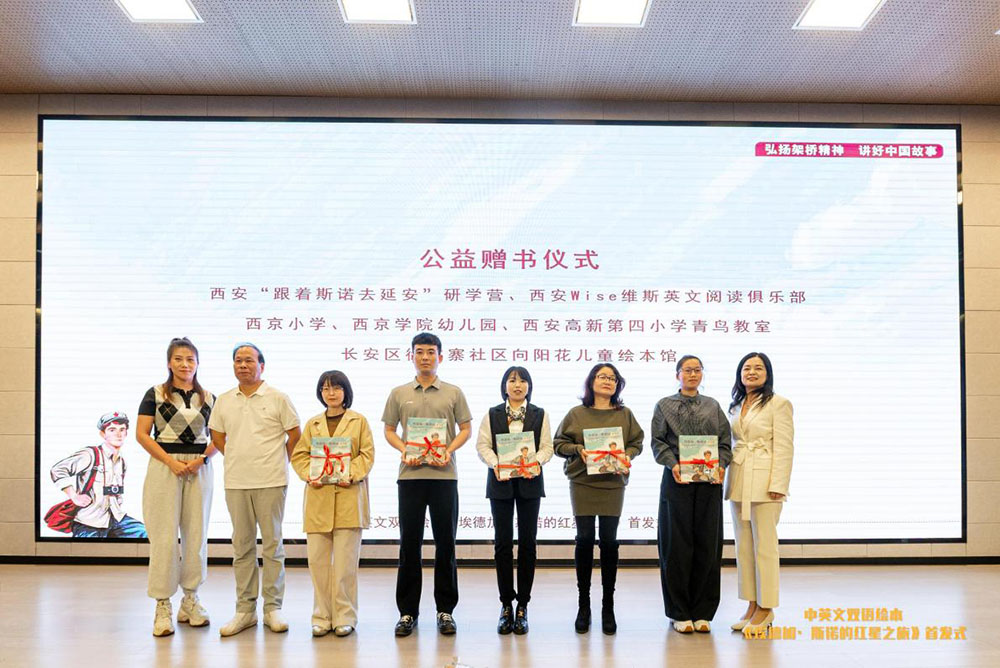 活动现场,主办单位代表和创作团队成员还分别向中国工合国际委员会、北京斯诺旧居纪念馆盔甲厂宾馆、八路军西安办事处、西咸新区冯党村社区、西安“跟着斯诺去延安”研学营、西安“Wise维斯英文阅读俱乐部”、西京小学、西京学院幼儿园、西安高新第四小学青鸟教室、长安区徐家寨社区向阳花儿童绘本馆赠书。