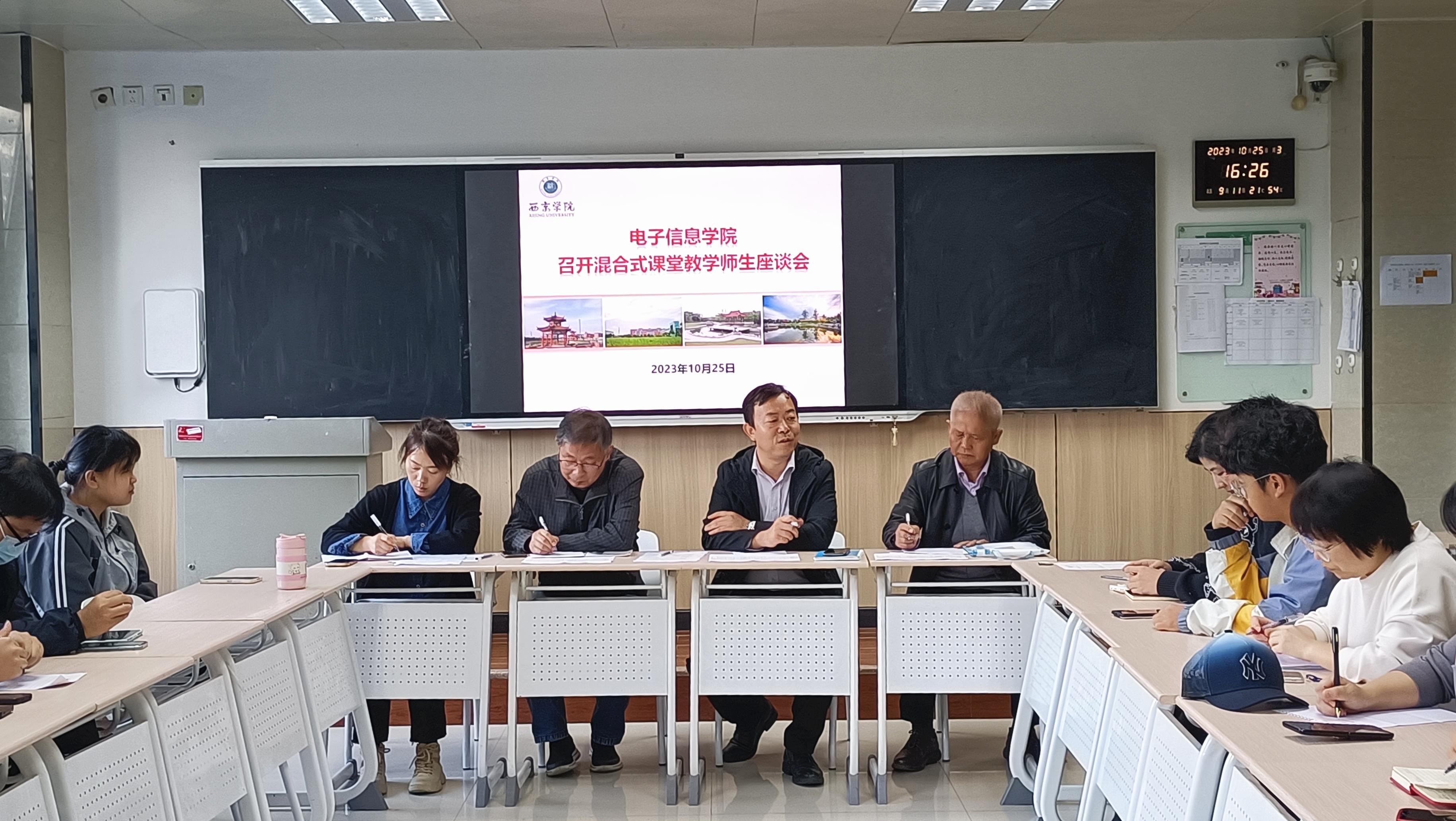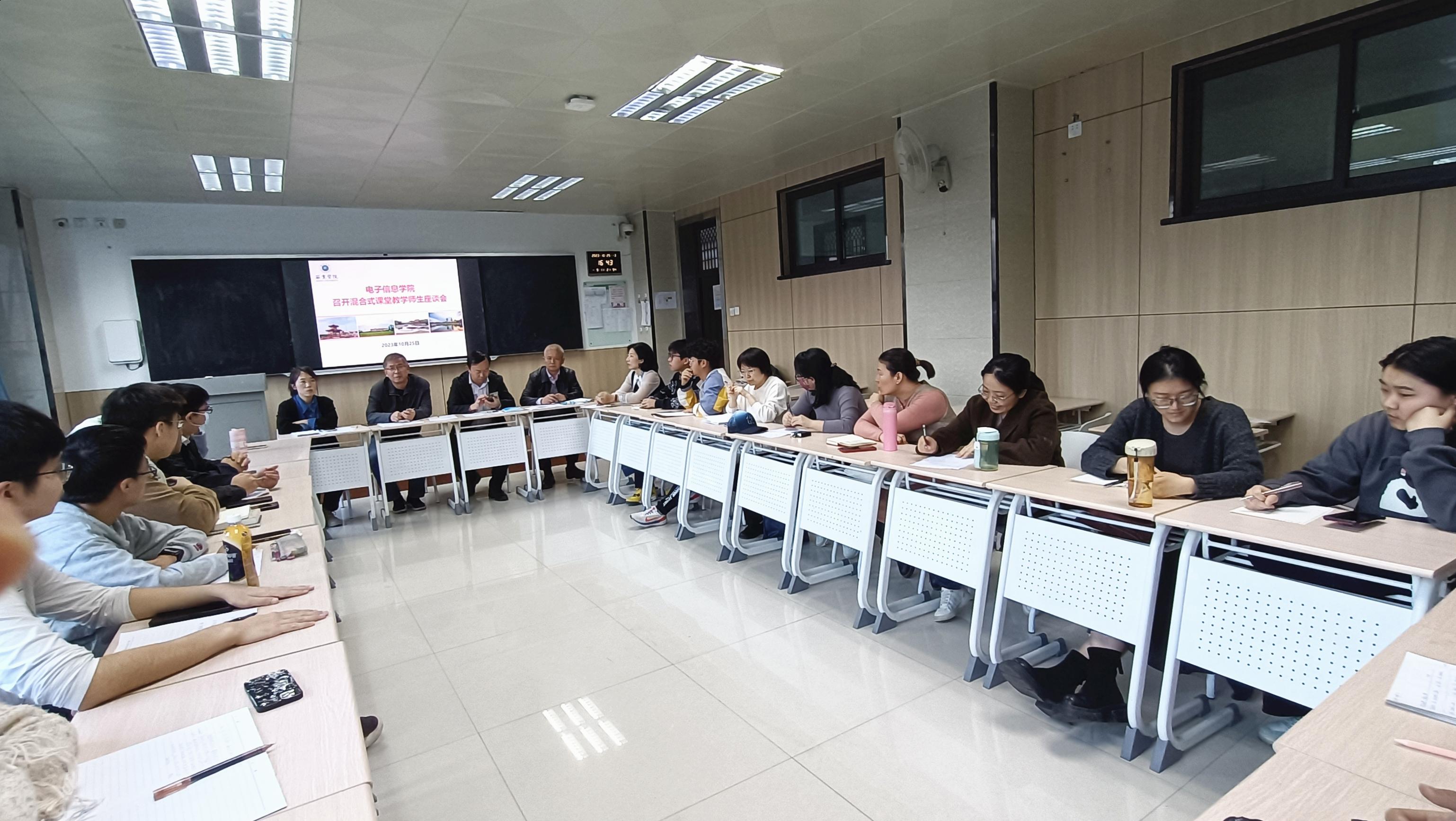 为推进混合式教学改革,提高学生学习效果,10月25日下午,电子信息学院在2335教室召开混合式课堂教学开展情况师生座谈会,学院教学副院长辛督强,教学督导杨亚东、刘福华,相关科任教师以及学生代表、教务科全体人员参加座谈会。