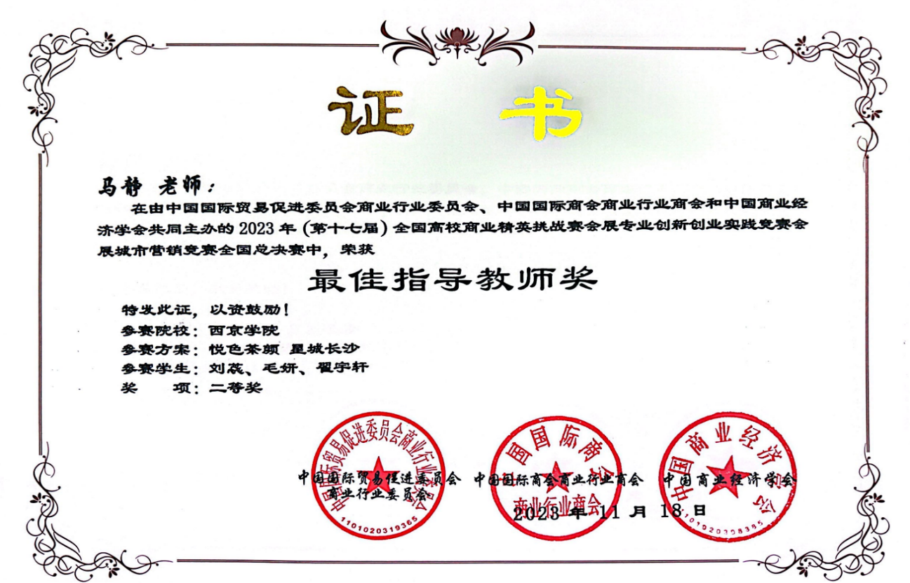 为了落实项目,马静及其团队成员多次深入该公司生产、销售、财务及会展营销等部门进行实地调研,帮助企业梳理业务流程,并对部门负责人进行商品国际化销售系统基础知识专业培训,同时公司会展营销部门也参与学校团队参赛项目“悦色茶颜 星城长沙”的策划方案指导,帮助团队在本次全国总决赛中获得了全国二等奖的优异成绩,西京学院荣获优秀院校组织奖。