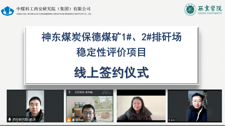 12月12日,土木工程学院与中煤科工西安研究院(集团)有限公司就《神东煤炭保德煤矿1#、2#排矸场稳定性评价》项目举行了合同签署仪式,土木工程学院项目负责人袁克阔和中煤科工西安研究院(集团)有限公司项目负责人姜涛等在线上签约。