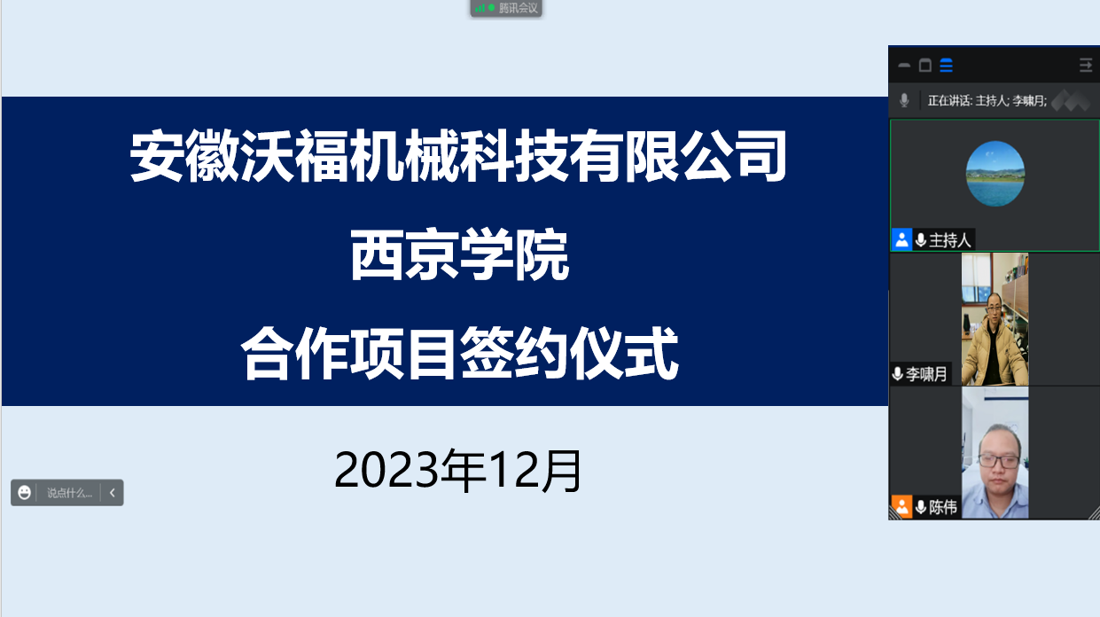 12月26日,计算机学院与安徽沃福机械科技有限公司就“基于数学软件和机器视觉的活塞组件智能分拣系统的技术开发”项目,举行了技术开发合同线上签约仪式。计算机学院项目负责人李啸月老师和安徽沃福机械科技有限公司项目负责人陈伟出席签约仪式。