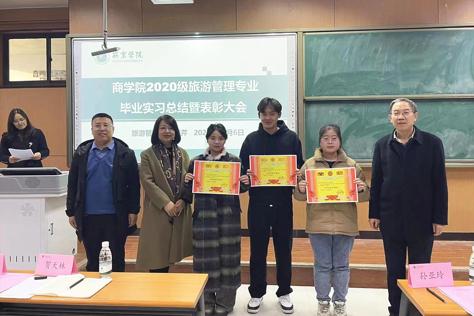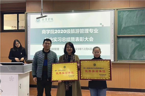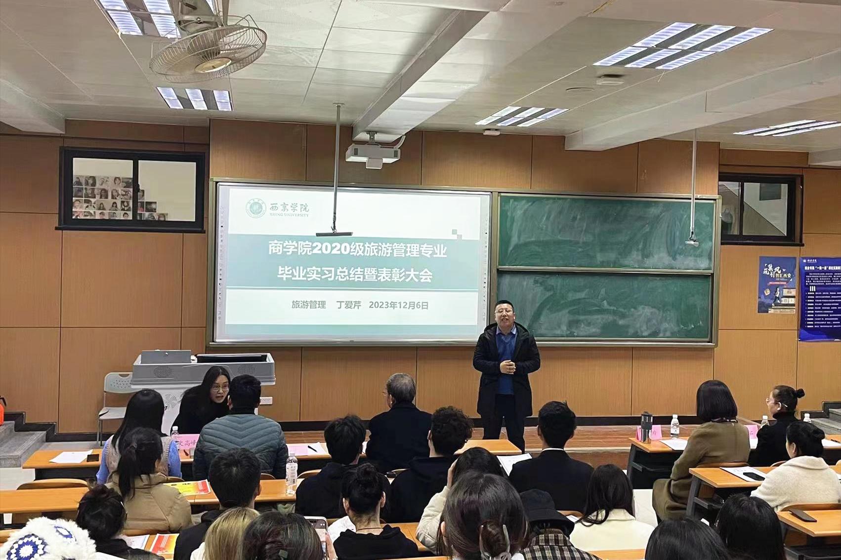 为总结经验,激励先进,12月6日下午,商学院2020级旅游管理专业毕业实习总结暨表彰大会在2121多媒体教室举行,西安凯悦酒店人力资源总监孙亚玲,西安城市观光车运营管理有限公司经理张均汝,商学院副院长梁林蒙、教务处实践教学科科长刘学通、教学质量监督处督导贺天林,旅游管理专业全体老师及一百余名学生参加了此次大会。