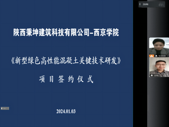 1月3日,土木工程学院与陕西秉坤建筑科技有限公司就《新型绿色高性能混凝土关键技术研发》项目举行了线上签约仪式,将对进一步发展学院学科优势、深化校企间科研合作具有积极推动作用。