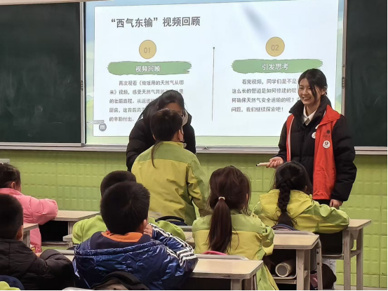 活动以国家重大工程“西气东输” 为切入点,通过生动视频展示能源传输过程,激发孩子们对管道安全的好奇与关注。志愿者以通俗语言讲解管道结构、功能及建设流程,将专业知识转化为易懂的 “地下公路” 故事,深化学生对能源安全的理解。