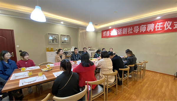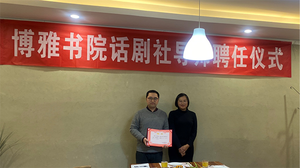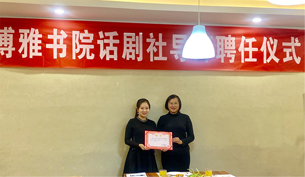 聘任仪式上,马璐为书院话剧社聘任指导老师何婕、李雨蒙颁发聘书,对传媒学院及受聘的两位老师表示感谢,对书院话剧社发展现状及结构进行简单介绍,同时也希望话剧社能不断创新活动形式,丰富活动内容,提高活动质量,提升活动品味,使话剧活动与学生专业、生活、创新创业相结合,充分展示当代大学生的素质及激情洋溢的精神风貌,话剧社也要不断扩大,提炼话剧社特色,打造文化精品,致力使博雅书院话剧社走出校门,走向大众。之后两位老师均发表自己对博雅书院话剧社未来发展的展望及憧憬,同时表示会与书院精诚合作,使书院话剧社内容品质不断提升,争取创作出让全校师生耳熟能详的优秀话剧表演作品,树立话剧品牌,为学校“双升”工程助力。