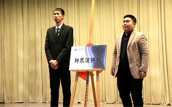 首先,主持人介绍了“神禾”演讲社和“京华”朗诵社成立的背景、社团各项活动安排及未来的发展规划,并宣布了两个社团的新任社长名单:谢臻担任“神禾”演讲社首任社长,王涛担任“京华”朗诵社首任社长。随后,发展科科长范光和事务科科长何权红为新成立的两个社团进行了揭牌。