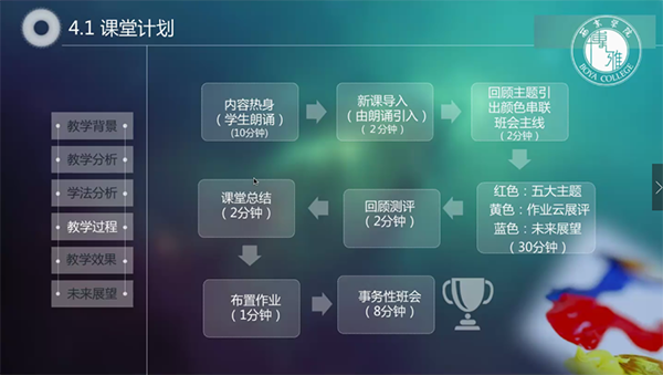 全体参赛辅导员高度重视,认真准备,结合各自所带专业,精心设计班会环节,辅导员化身“学生”“带货王”“合同甲方”等角色,在精巧的班会设计中,用学生喜欢的形式引导学生分享和总结前五次班会的成长和收获。辅导员牛德胜利用自身出众的口才变身“带货王”,用“出售”的形式让学生选择前五次班会的收获,由此了解的喜好和收获;高瑞莹的班会设计精巧而有内涵,她将班级学生先提前分成“实力担当组”、“找茬小分队”等小组,在班会中采用小组汇报、同辈评价、老师评价、颁奖等环节调动学生积极性,和学生探讨班会的收获;魏万庭、赵娟等艺术组的老师采用三原色板块设计、建筑甲方评判等结合专业的班会形式对班会进行设计,让人耳目一新。最终,牛德胜、高瑞莹等六位老师分别获得一、二、三等奖,蔺致远和王文卜获得进步奖 。
