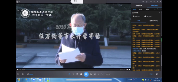 接着,辅导员组织各班级学生认真观看了学校统一制作的精彩视频。各年级同学通过语音连麦、视频通话、弹幕、在线交流等方式,紧紧围绕董事长和校长的讲话和指示精神,与辅导员展开了激烈的学习和讨论。同学们纷纷表示:董事长和校长的讲话让人备受鼓舞,也为我们今后的工作和学习指明了方向,大家一致表示将及时调整状态、规范作息时间、上好每一节网络学习课程,不断提升自己,以实际行动践行“无私奉献、报国为民、挑战极限、追求卓越”的万钧精神。