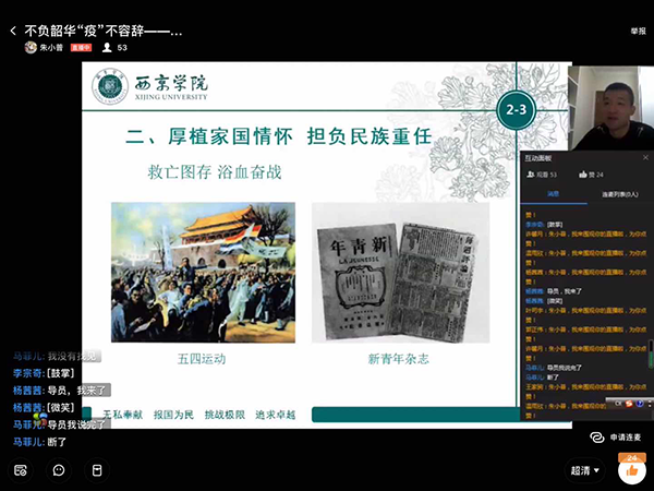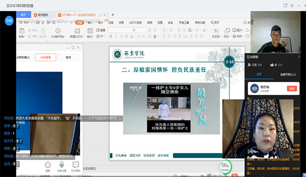 首先,辅导员老师带领同学们了解责任和担当的涵义。通过范仲淹、周恩来、90后武汉女孩儿吴尚哲、湖南省儿童医院感染科“95后”护士胡佩等案例,向同学们诠释了什么是责任;通过大禹、诸葛亮、林则徐、钟南山、张定宇、快递小哥李杰等案例,使得同学们了解到什么是担当。同时辅导员指出:爱国是最大的责任担当,爱国的责任就是保家卫国的责任。不是只有英雄才能担当,每一个平凡人扛起自己的责任,就是担当。