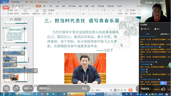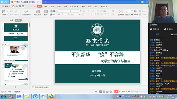 为提升新时代青年的责任与担当意识,进一步增强大学生的社会责任感,3月15日晚,南洋书院通过召开以“不负韶华,‘疫’不容辞”为主题的主题教育活动,引导学生树立“责任”意识,担负民族重任,担当时代责任,谱写青春乐章。书院75个班级、校团委书记马杨利、书院院长王培涛、学生事务科科长何权红、学生发展科科长范光、校团委炊大力、王磊老师、书院科室学工干部及全体辅导员老师全程参与了本次主题教育活动。
