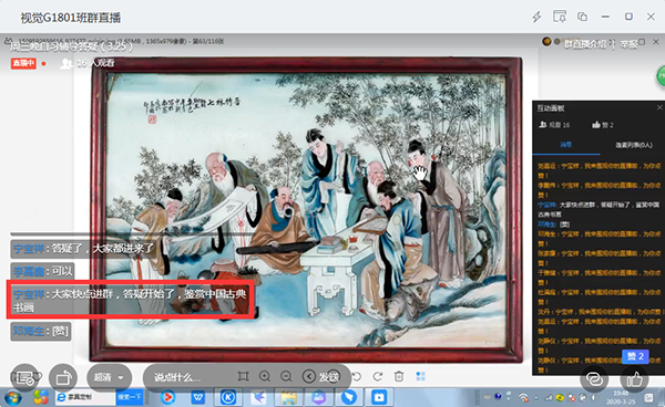 视觉传播与制作专业结合专业课程将中国古典书画鉴赏搬到了云端带到辅导答疑的课堂。宁老师谈到:《室内陈列设计》中有关于室内装饰画的陈设是室内设计的重要内容。想学好其设计,需要了解掌握中国古典绘画的精髓,懂得如何鉴赏,例如,画面构图、色彩搭配、绘制内容、落款等方面鉴赏分析。选择雅俗共赏的画作,符合大众的室内陈设画作,使室内陈列设计内容更丰富,更有内涵。