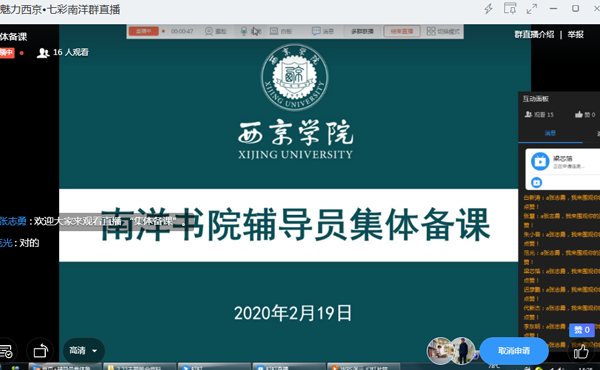 2月19日下午,南洋书院通过“钉钉软件平台”,组织开展了线上辅导员集体备课。教育教学质量监督处专职督导张慧、书院院长王培涛、学生事务科科长何权红、科室学工干部及全体辅导员参加了集体备课。本次集体备课会由学生发展科科长范光主持。
