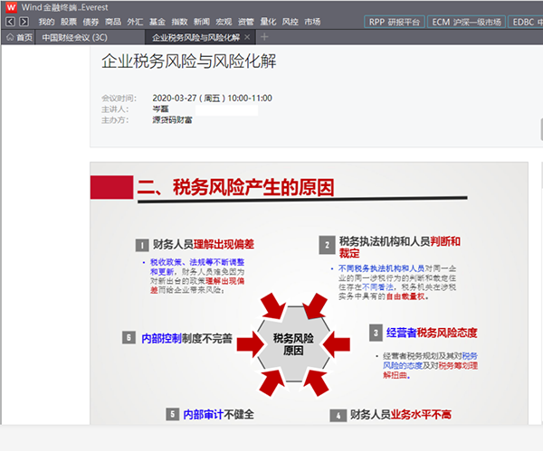 3月27日,应万得(Wind金融终端)邀请,我校会计学院审计专业硕士研究生导师岑磊副教授在万得(Wind金融终端)3C会议分享了主题为“企业税务风险与风险化解”的报告,全国范围内Wind金融终端使用客户聆听此次报告。