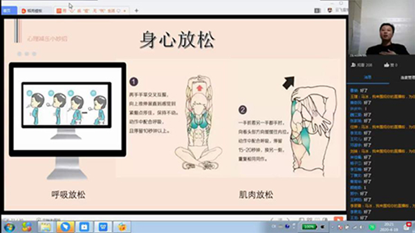 活动中,辅导员给学生教授了情绪调节和压力缓解的诸多方法,例如,呼吸放松、肌肉放松、冥想放松等等。学生们积极参与互动,气氛轻松愉悦。