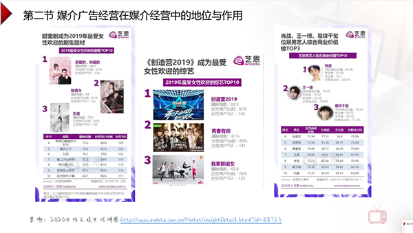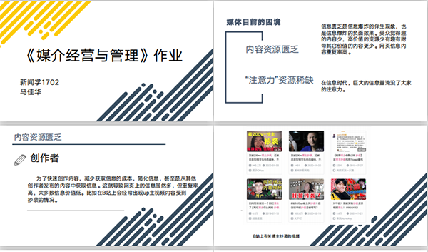 当前,互联网思维已经全面渗透媒介产品内容生产及经营管理的各个模块,媒介融合、去中心化、免费、自媒体、共享、维基、交互等互联网思维深入人心,王老师已经将课程中关于媒介经营的部分讲授完毕。她拿一些近期行业案例、论文、调查数据结合课程理论知识讲授。并在上课的时候穿插一下媒介机构、公司介绍。如:《庆余年》的粉丝受众,讲授媒介广告的时候举例《小茗同学》的广告策划方案、还有《青春有你2》等等,基本都是当下行业中比较火的一些实际的案例带入课程中。再下个阶段的媒介管理授课中,王老师将运用行业思维开展分组项目化实践教学,通过课堂训线、小组讨论、提交小组报告等开形式,要求学生通过所学分析媒介运用、媒介产品站略、分享成功的营销案例,并在此基础上完成小组作业,设计内容产品及营销策划并制作一个范例实例,比如运营一个微信公共账号,内容(至少出一个原创内容产品),产品战略包括用户、定位、营销策划等,再给他们点评,课下让他们对感兴趣的多查,多给自己有探索的空间。训练学生基本媒介经营管理技能,了解自身核心优势,帮助学生中深对传媒行业的理解。学生的主观能动性与学习热情被调动,提高了课堂参与感和认同感。