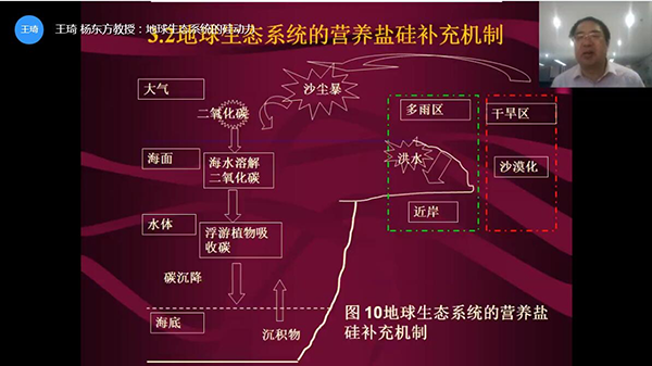 讲座中,主讲人还介绍了沙尘暴、洪水、台风等等自然现象对生态系统动态平衡的补充机制,地球生态系统向缺硅的水体输入大量的硅,导致浮游植物迅速生长和繁殖,将大量碳从大气迁移到海底,进而影响大气温度和水文的变化,控制气候的变化,气候最终控制了地球的变化。
