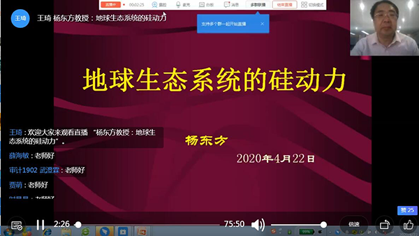 4月22日,会计学院邀请博士生导师杨东方教授通过在线直播方式作报告,本次报告会主题为“地球生态系统的硅动力”,重点讲述地球生态系统保护,师生300余人聆听报告。