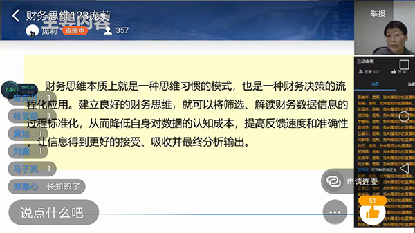 过程中,庞教授还对学生讲述了培养财务思维的意义,财务思维本质上是一种思维习惯模式,是一种财务决策的流程化应用。她谈到建立良好的财务思维,可以将筛选、解读财务数据信息的过程标准化,从而降低自身对数据的认知成本,提高反馈速度和准确性,让信息得到更好的接受、吸收并最终分析输出。