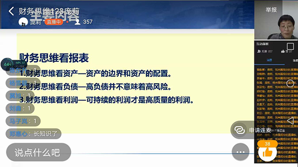 报告会中,庞教授讲到,财务思维指的是懂财务的人应该具备的思维方式,她通过列举资产负债表、利润表、现金流量表等公司主要报表实例,指出财务思维下的报表实质,从企业内部来看,报表是管理和决策的工具,从企业外部来看,它是最通用的商业语言。