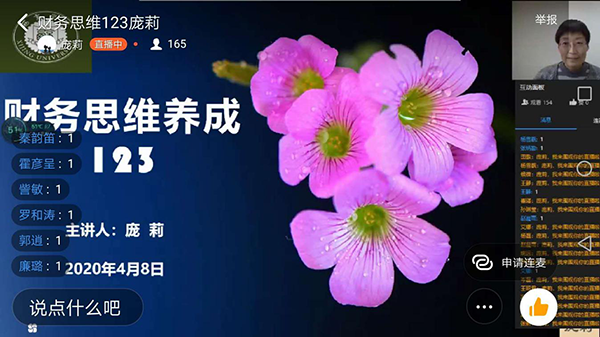4月8日,陕西省教学名师、会计学院庞莉教授通过在线直播为师生作“财务思维养成123”的学术报告,350余名师生聆听报告。