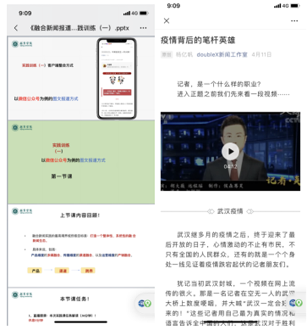 杨老师将课程按照“理论讲授15大知识专题+深度剖析100个以上优秀融合新闻案例+实践训练融合新闻策划、网络图文报道、短视频新闻报道、新媒体音频报道、H5新闻”这样的分组工作室项目化教学的方式在云端给学生们正享受着一顿“大餐”。让学生通过小组的形式将老师教授的内容进行“实战”,然后在课堂展示给同学生们和老师,让同学们和老师相互点评,在云端增加学生的参与度,调动学生学习的积极性。充分让学生在专业上找到方向,为自己的择业和就业增加信心,让教与学在云端更加给力。