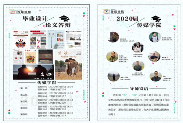 传媒学院2020届本科毕业生毕业论文撰写到答辩等一系列工作都是通过“线上+线下”的方式进行着,通过师生们共同努力,毕业答辩于5月18日分四个会场进行,为同学们大学学习生涯划上圆满的句号。本次学生们毕业答辩作品包括:推广项目全案、影像作品、新媒体产品设计、深度调查新闻等同学们以独特的视角、开拓的思维、深入的笔触对选题进行深度挖掘,展示出社会中多个领域的不同面貌。