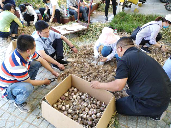 全体教职工按照分工在各自的区域内干的热火朝天。虽然烈日炎炎,但是并没有影响大家干活的热情。有的挖蒜,有的拾蒜,有的运输,有的整理装箱,大家认真负责、良好协作,整个过程都充满着和谐、喜悦。经过3小时的努力,学院片区土地内的蒜全部收整完毕。